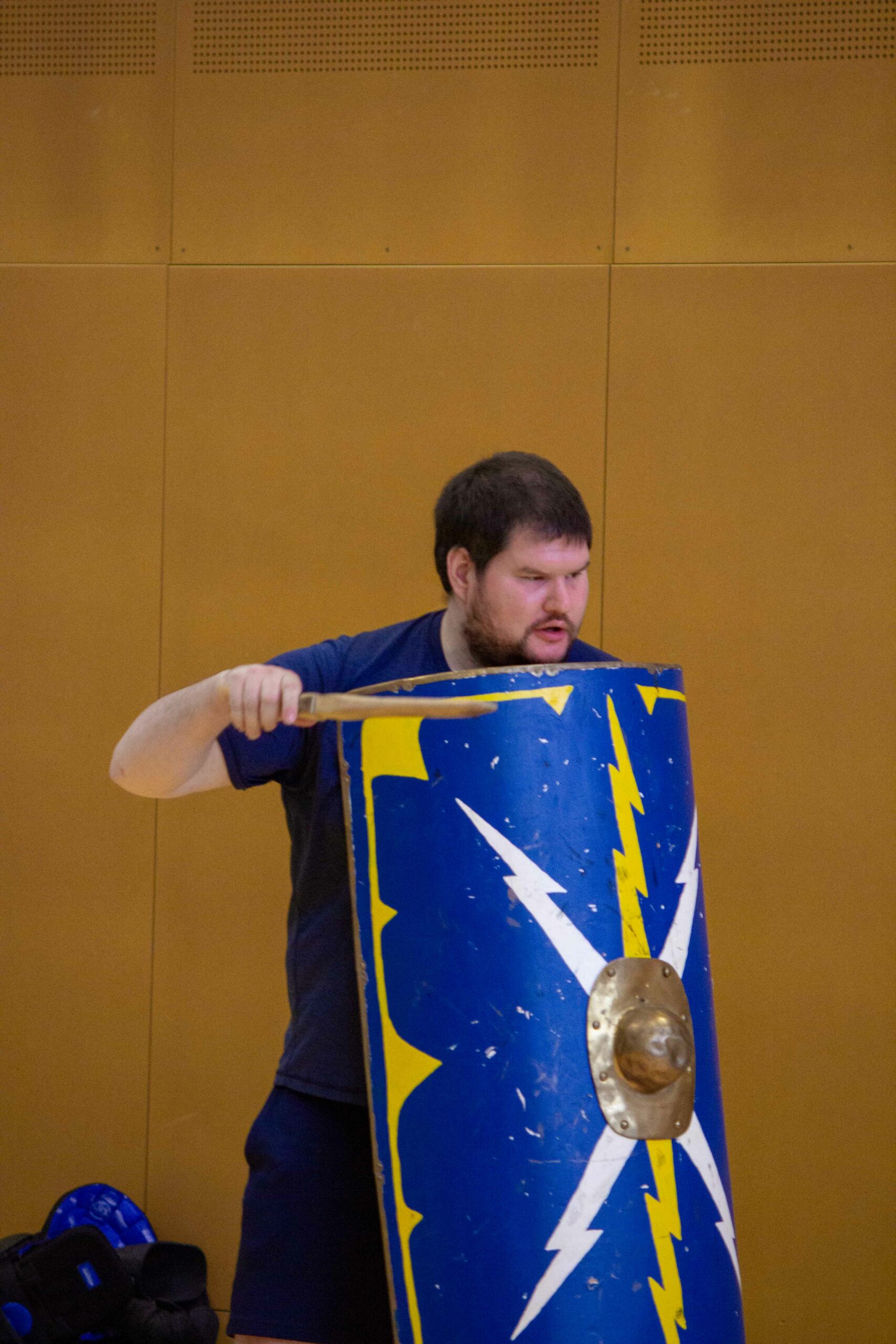 So wähle die Waffen des Hoplomachus – Stoßlanze, Gladius und Rundschild.